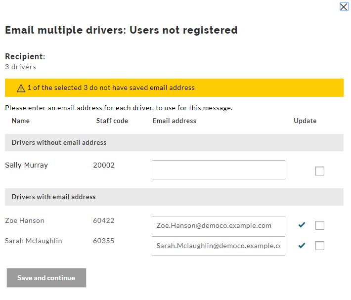 In the example below, for sending to multiple users, one email address is missing and needs to be added. If the update box is ticked, the user’s account will be updated with the email address.The other two email addresses are valid but can be changed. If they are changed, the user’s account can optionally be updated with the new email address by ticking the update box.